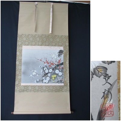 - 掛軸 花 縦140cm 横65cm ※裏にシミあり tm2406-26-3