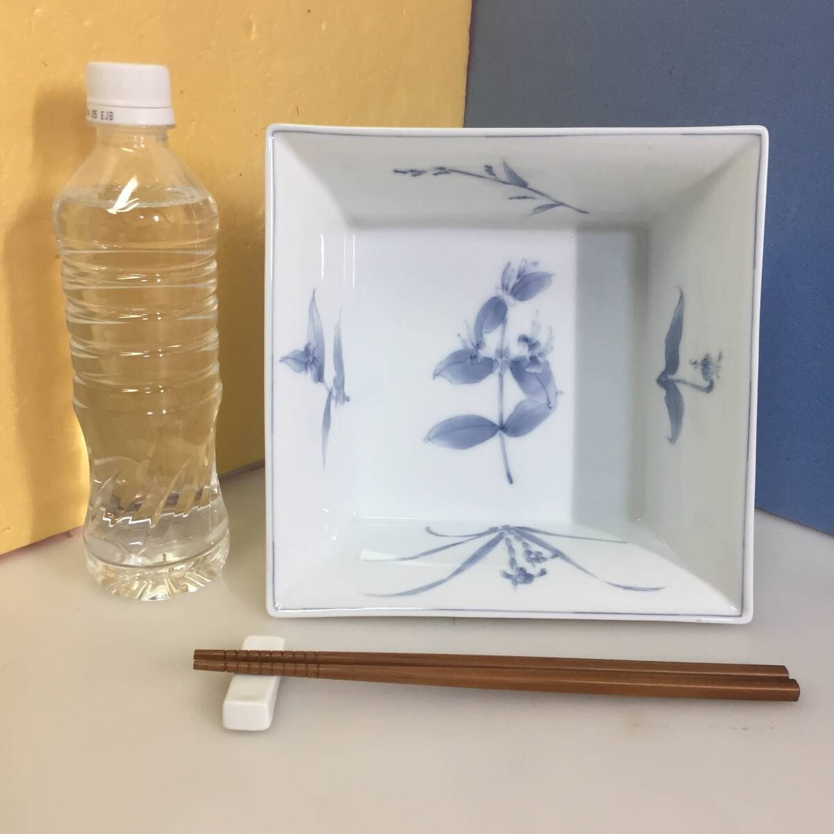 - 即決□有田焼 庫山窯 角鉢大鉢 単品 20cm×20cm 高さ8.5cm 白×淡青 花絵 食器 和食器 小料理 料亭 割烹 磁器 涼を感じる皿 【現状渡し】
