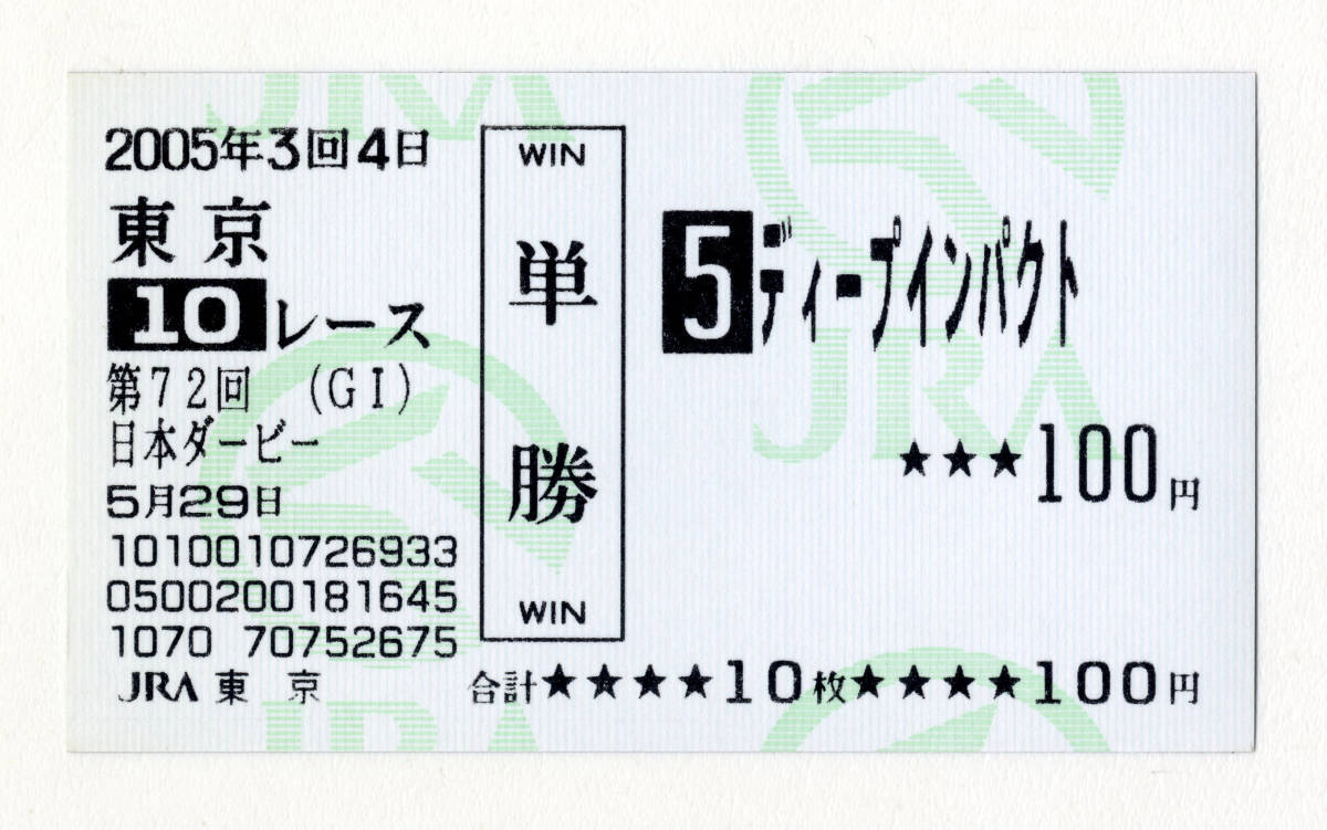 - ★ディープインパクト 第72回日本ダービー 現地的中 記念 単勝馬券 旧型馬券 2005年 競馬 JRA 武豊 三冠馬 三冠達成 極美品 送料無料即決 2