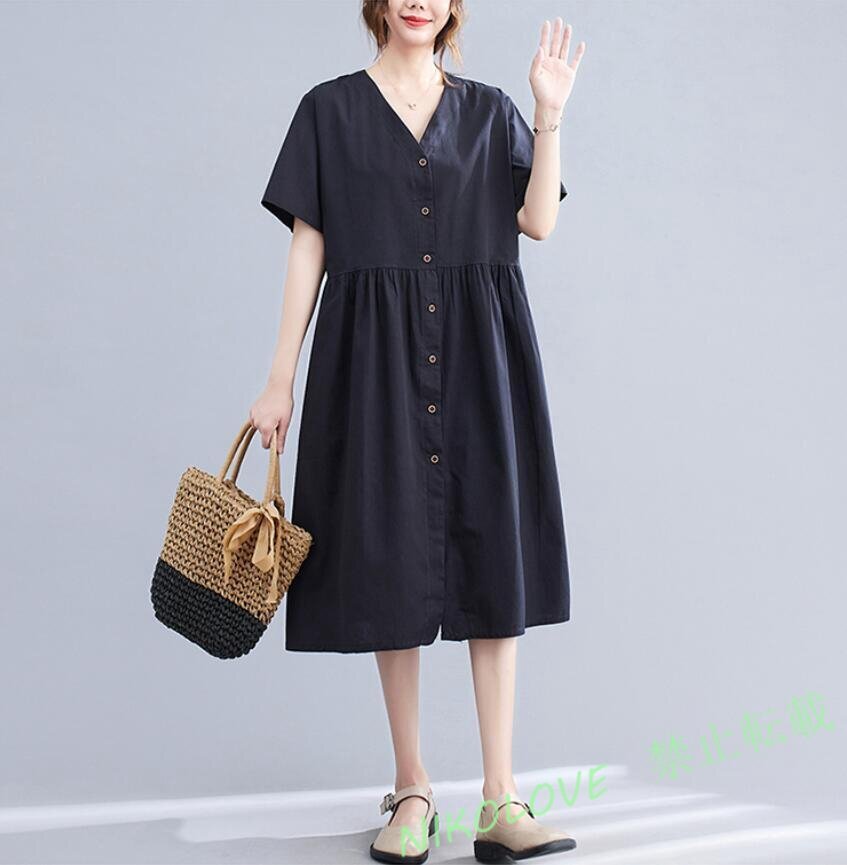 - 新品ロングワンピース 綿混 春夏 半袖 ゆったり カジュアル 森ガール 大きいサイズ 着心地 着痩せ ミモレ丈 ワンピース ブラック LJ079