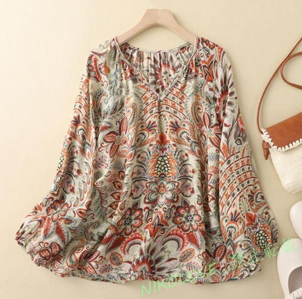 > 新品夏ブラウス 綿麻 プリント柄 長袖 チュニック カジュアル Vネック キレイめ 着せ 大きいサイズ 大人 トップス カーキ M LH719