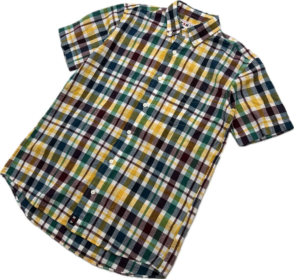 > VAN JAC ☆ マドラス チェック 半袖 ボタンダウン シャツ イエロー グリーン ネイビー M 春夏 定番 アメカジ 大人カジュアル ヴァン■H314