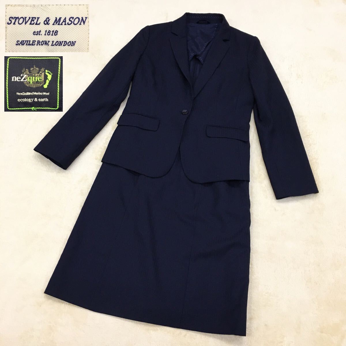 > neZque生地 ストーベルアンドメイソン はるやま メリノウール スカートスーツ上下 シャドーストライプ レディース 11号×9号 紺色