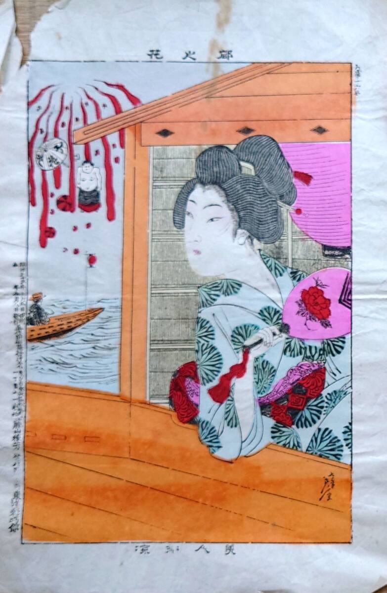 - f24070543〇一枚刷物 彩色石版画 美人 花火 明治33年〇和本古書古文書