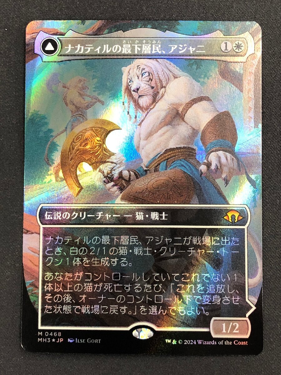 ●カード名:ナカティルの最下層民、アジャニ/Ajani, Nacatl Pariahナカティルの最下層民、アジャニが戦場に出たとき、白の2/1の猫・戦士・クリーチャー・トークン1体を生成する。