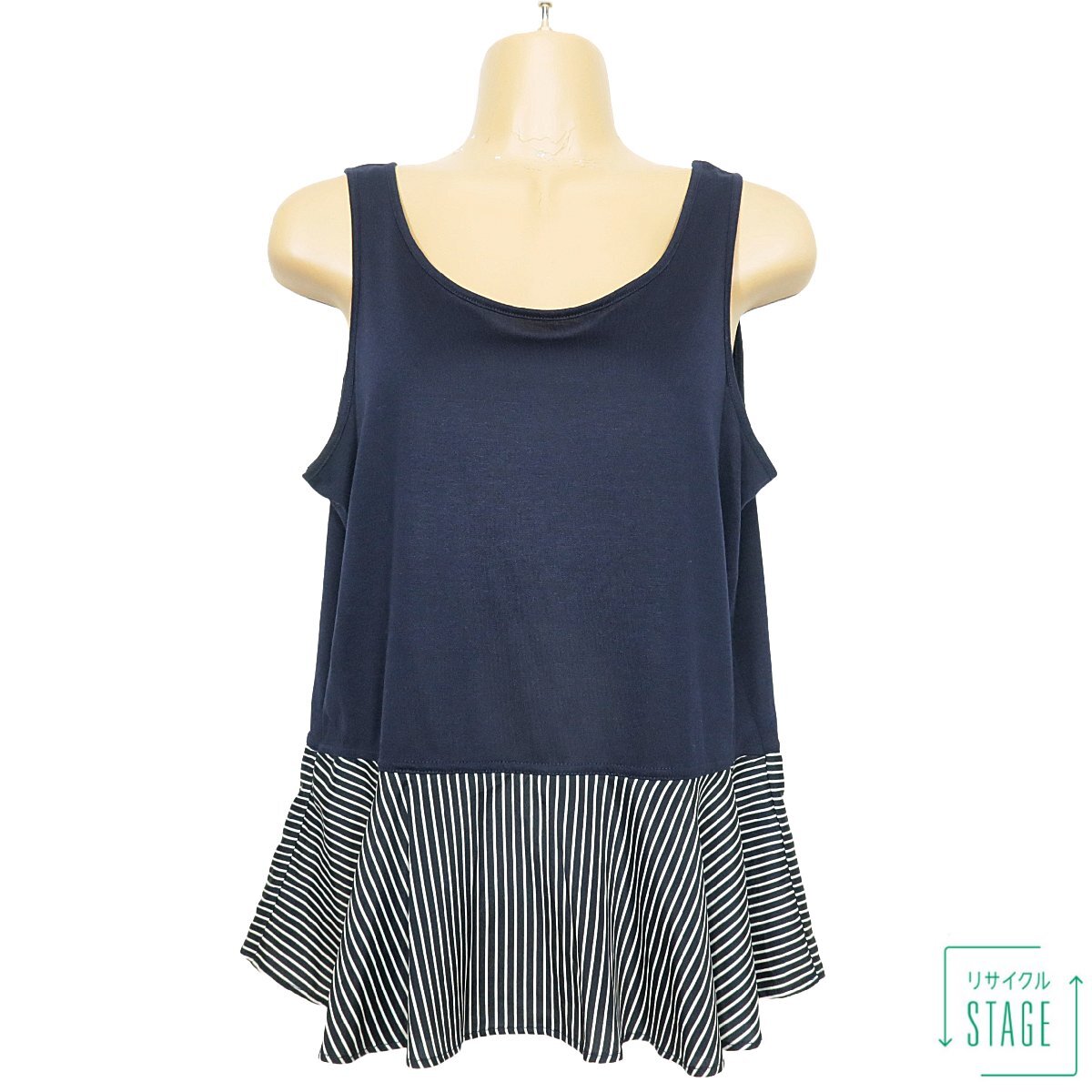 > アンタイトル★ノースリーブカットソー 大きいサイズ4 フェミニンなティアードデザイン♪ストライプ柄 レターパック可 紺系 z8295