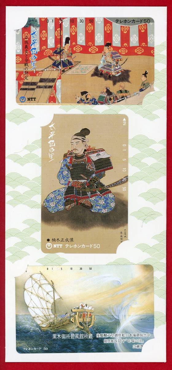 - 【台紙付き3枚セット】テレホンカード50度☆太平記の里☆正成義貞 楠木正成 龍雲船〈S01〉