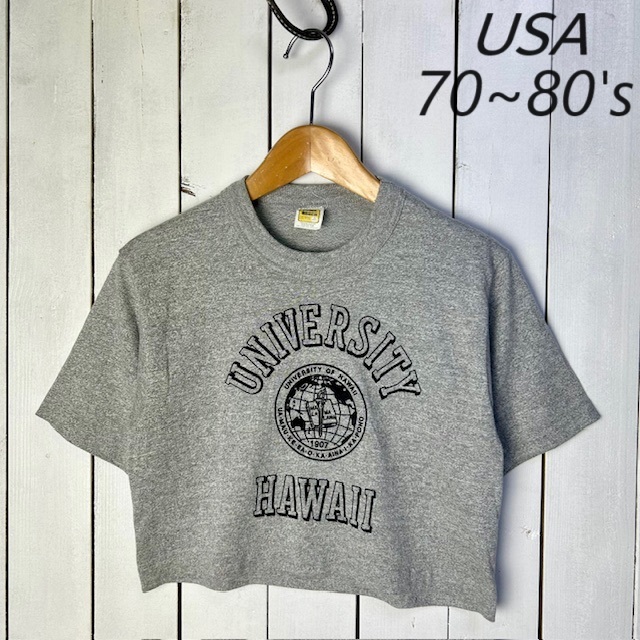 > T●382 USA古着 70s~80s USA製 ショート丈 カレッジTシャツ S~M オールド ヴィンテージ フロッキー シングルステッチ VelvaSheen
