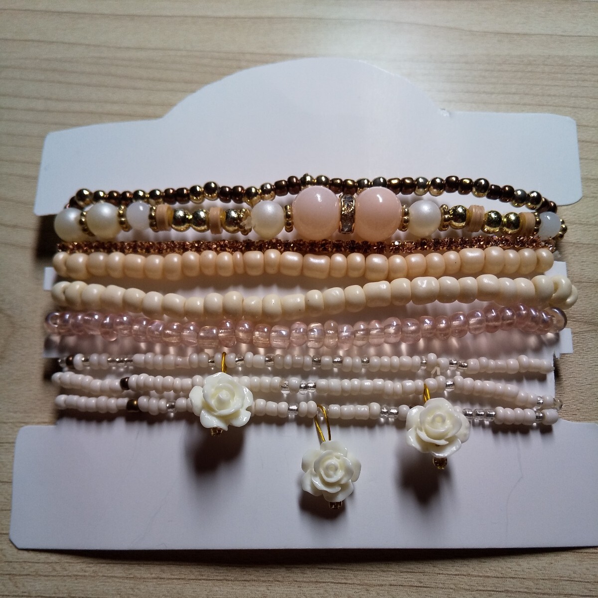 - 9連重ね付け カジュアルブレスレット 内径約15,5~16㎝ 女性Mサイズ アイボリーピンク ビーズ製 サイズ変更対応 有 ブリコラ屋