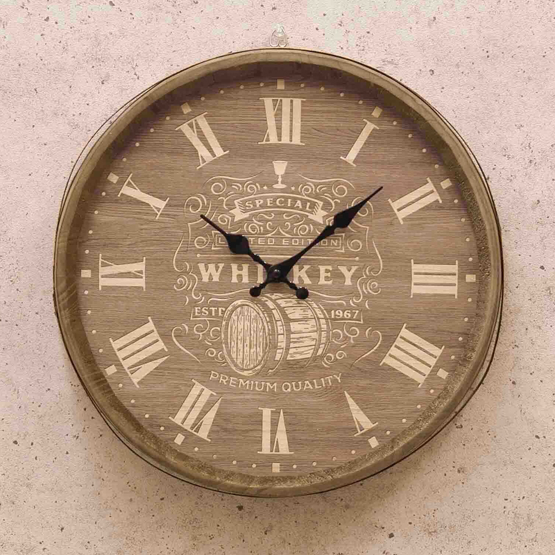 - 壁掛け時計 ウォールクロック アナログ 円 丸 おしゃれ インテリア ウイスキー 樽 モチーフ デザイン 木製 秒針無し アメリカ カジュアル