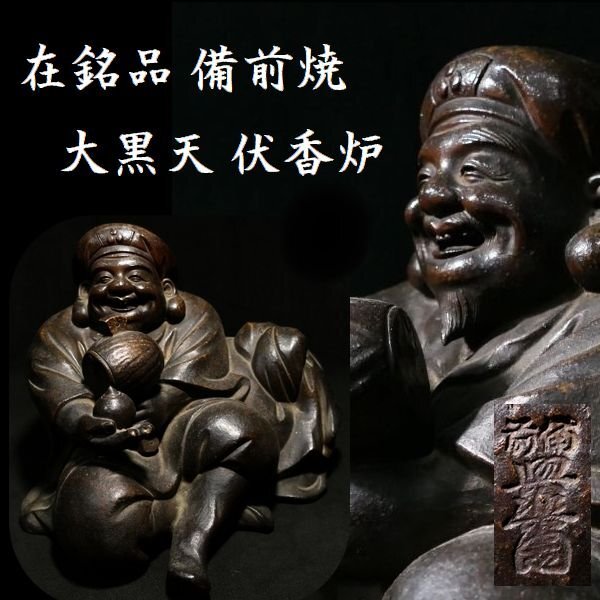 > 【 恵 #1233 】 在銘品 見応えある備前焼 大黒天 伏香炉 検:香炉/香道/備前/置物/七福神