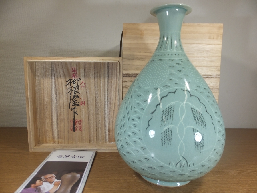 - 【真作保証】 柳海剛 (柳根瀅) 自作 高麗青磁白黒象嵌窓絵柳魚紋花瓶 人間文化財 コレクター放出品 (柳宗悦 池順鐸 安東五 方澈柱) 韓国