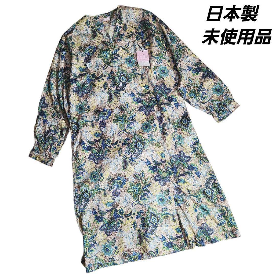 > ペイズリー総柄・ゆったりデザイン・セミロング丈ワンピース・Vネック 緑グリーン他 マルチカラー 日本製 68346