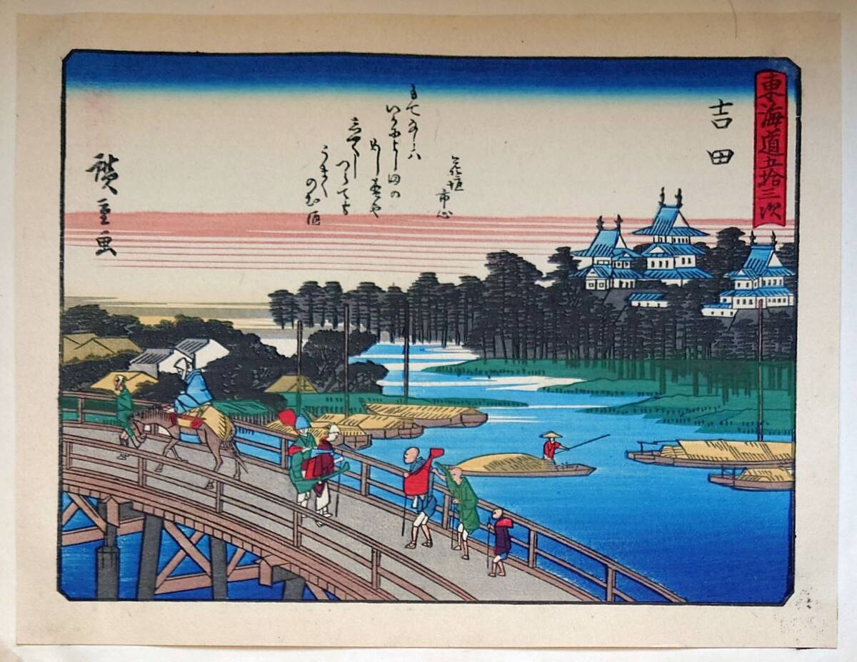 - f24080035〇彩色木版画 佐野喜版 狂歌入東海道五十三次 吉田宿 広重 複刻昭和年代〇和本古書古文書