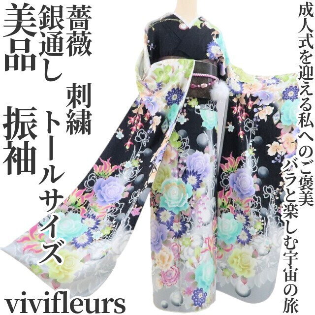 - tomihisa 美品 vivifleurs 薔薇 刺繍 銀通し 着物 成人式 正絹 トールサイズ“成人式を迎えるご褒美...バラと楽しむ宇宙の旅”振袖 4041