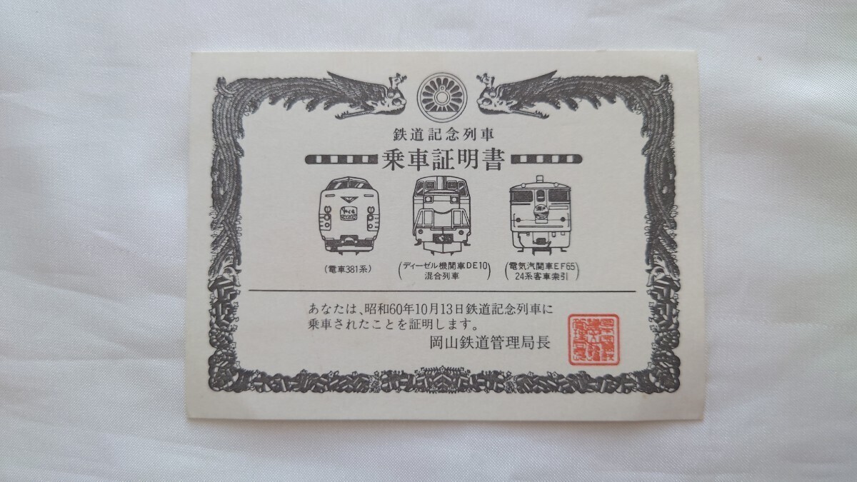 - △国鉄岡山管理局長△鉄道記念列車 乗車証明書△昭和60年