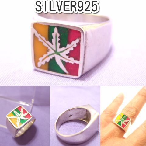 > 横浜最新 シルバー925SILVER銀リング♪魅惑の印台マリファナ ラスタカラー 20.5〜22号 メンズレディース 送料220円ξgRξ ξ指輪8