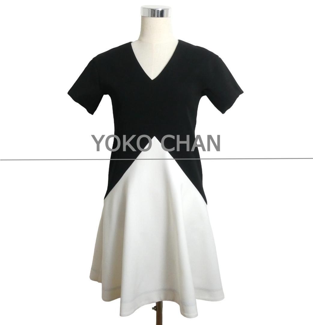 > 美品 YOKO CHAN ヨーコチャン 36 PO混 バイカラー Vネック 半袖 フレアワンピース ショートスリーブワンピース オフホワイト×ブラック