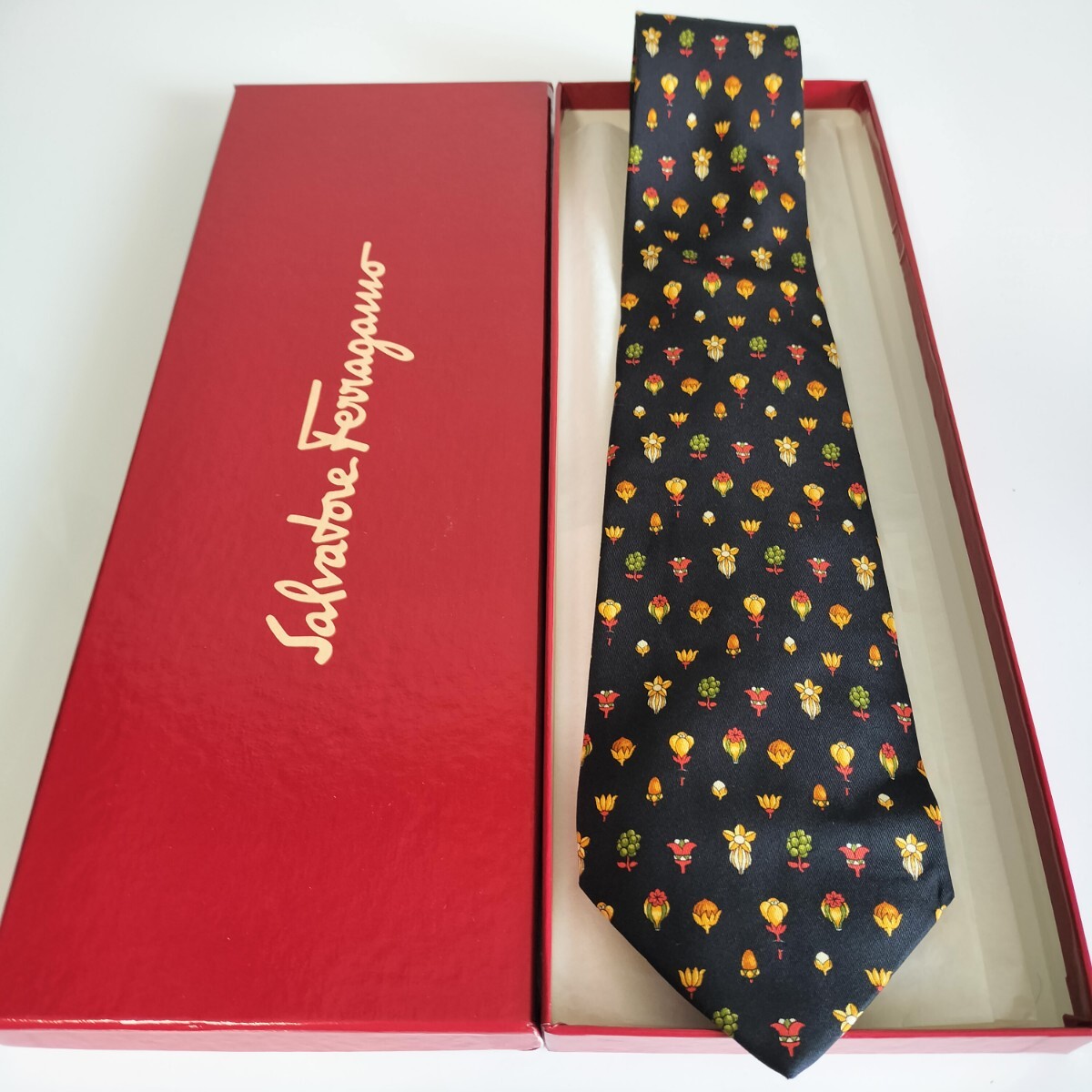 - Salvatore Ferragamo(サルヴァトーレフェラガモ)黒色んな果物柄ネクタイ