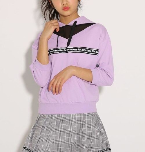 > ラスト 新品 PINK-latte ニコラ掲載フード付すけレイヤード風トップス ライトパープル 15(XS150cm) 定価3850円