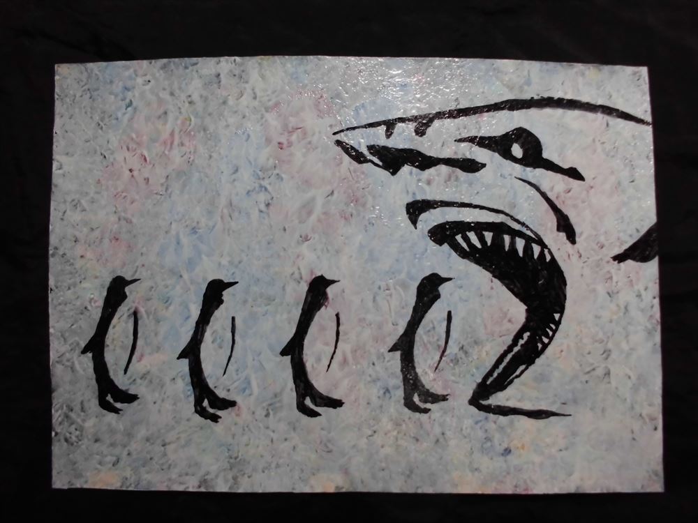 > 絵画、絵、アート、Art、藝術、インテリア、特殊加工、ペンギン、サメ、真作、「集団同調性バイアス」路久義昌 ※額縁に入れて発送します