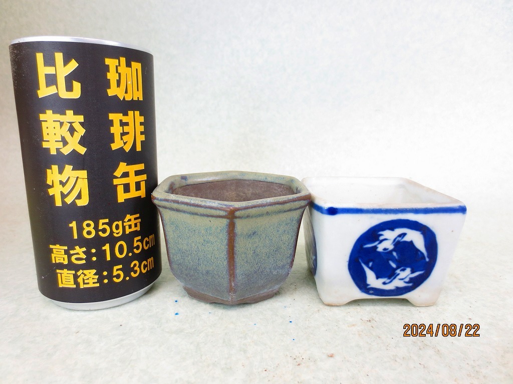 - [緑の市場] 小品盆栽鉢 銘無し 2点組 絵入白釉正方鉢/六角鉢(R287)定形外郵便送料無料/ゆうパック発送有料*選択可※無料発送はポスト投函