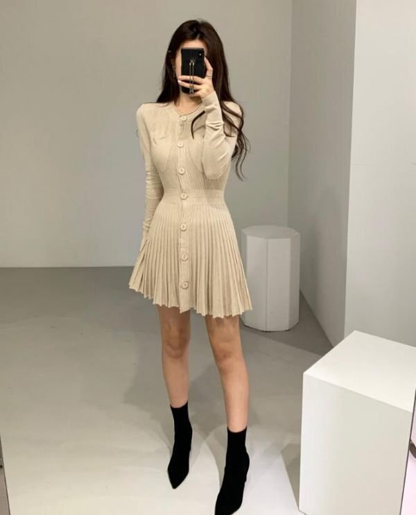 - 新品 S~L前開きボタン プリーツスカート sexy 可愛い大人 おしゃれ ストレッチ素材 ミニ丈ニットワンピース LA1230