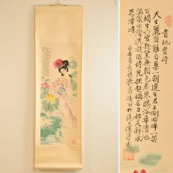 - C10378 青い団扇を持った美人に蓮花の掛軸《真作保証》
