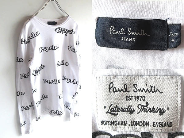 - ネコポス対応 Paul Smith JEANS ポールスミス ジーンズ PSYCHO MAGIC 総柄プリント ロゴワッペン カットソー 長袖 Tシャツ M ホワイト 白