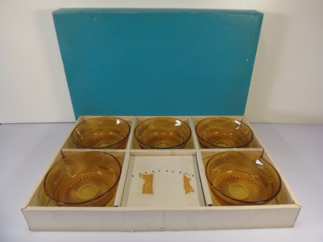 > r127 レトロ 【SOGAGLASS】 硝子小鉢 5客セット ふじ アンバー ※難有(付属スプーン紛失して無)