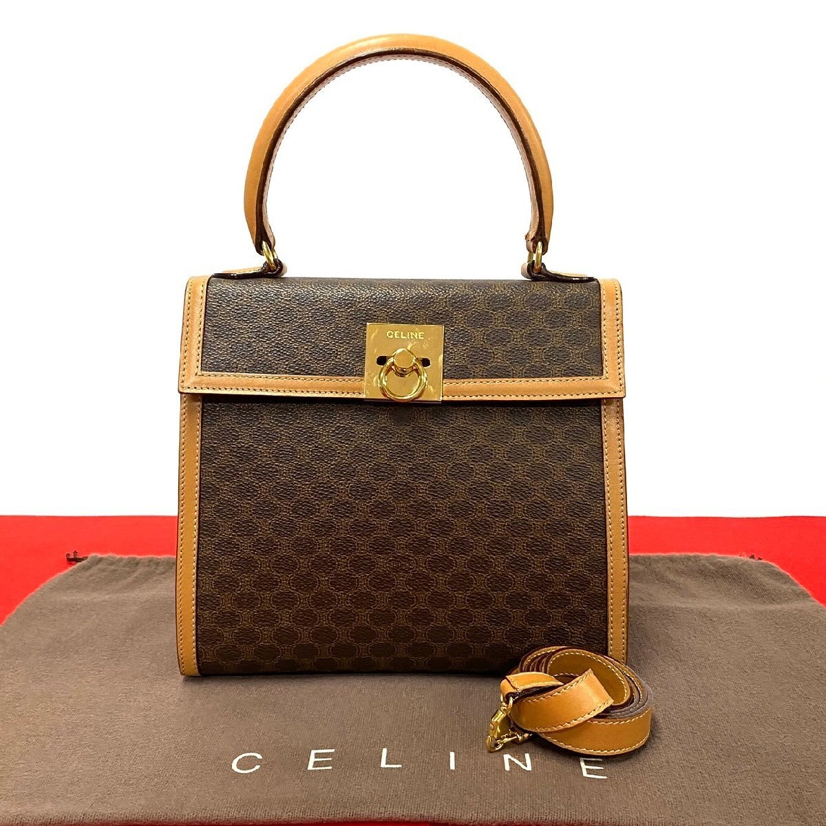 > 未使用保管品 CELINE セリーヌ マカダム ブラゾン トリオンフ 柄 ロゴ リング金具 レザー 2way ハンドバッグ ショルダーバッグ 茶 35397
