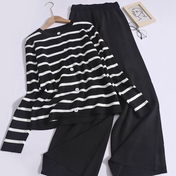 - 秋新品*ニット2点セット レディース セットアップ パンツドレス ボーダー柄 セーター+ニットパンツ ニットワイドパンツ 通勤* ブラック
