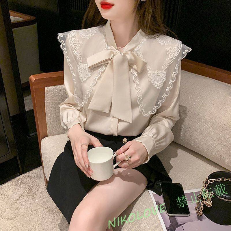 - 新品春 着やせ レディースきれいめ 可愛い リボン ボウタイ レース 長袖ブラウスシャツ オフィス LG682