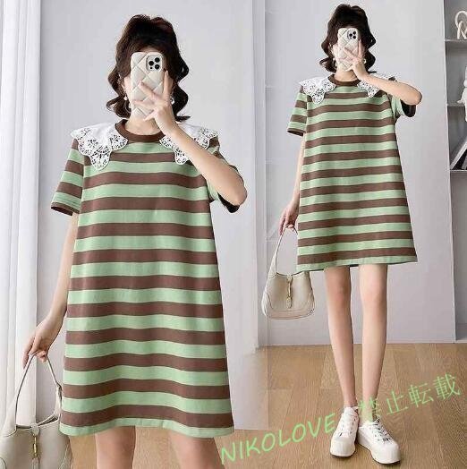 > 新品韓国風半袖ワンピース 切り替え バイカラー 体型カバー 着痩せ ボーダー柄 大きいサイズあり 2XL グリーンサイズ選択可 LG542