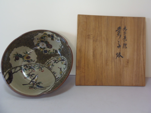 ●s900 【九谷焼 九谷陶岳】 菓子鉢 九谷色絵 ※難有(木箱いたみ酷いです)