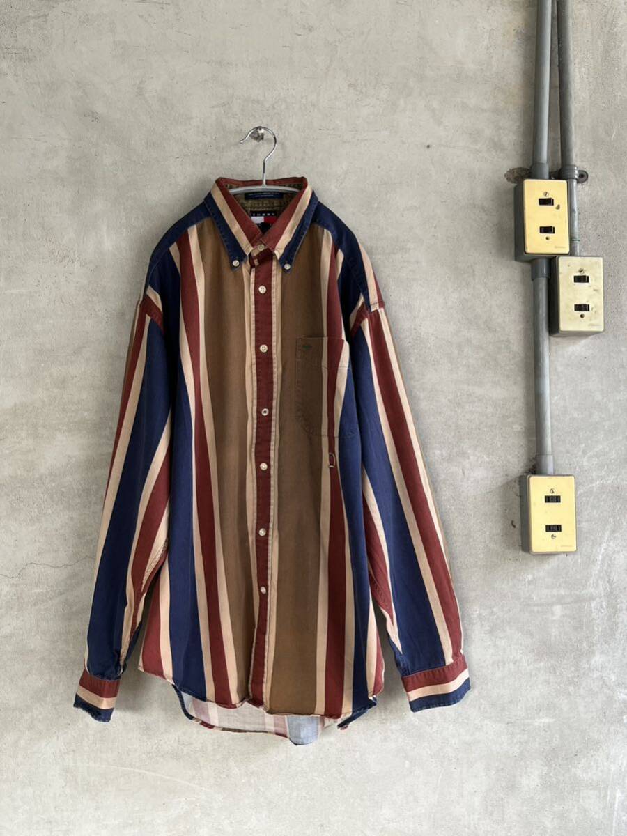 > 90s 90年代 OLD TOMMY HILFIGER オールド トミーヒルフィガー ランダム ストライプ 当時 ビンテージ 古着 半袖 大きい ロゴ ビッグサイズ