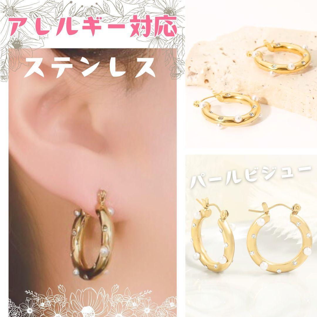 - 送料無料★akeeeeey★【限定】アレルギー対応 ステンレス フープ パール×ビジューピアス_Ⅰ|つけっぱなしOK フープピアス