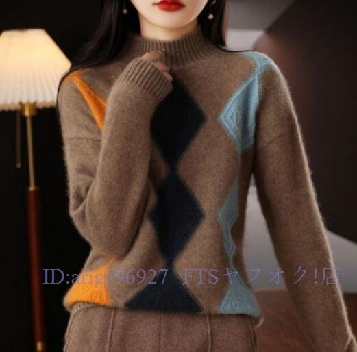 - A6036☆新品秋冬 上質 ミンクカシミヤ混 配色柄 ニットトップス ゆったり 気質良い おしゃれ 大人 ニットセーター コーヒー