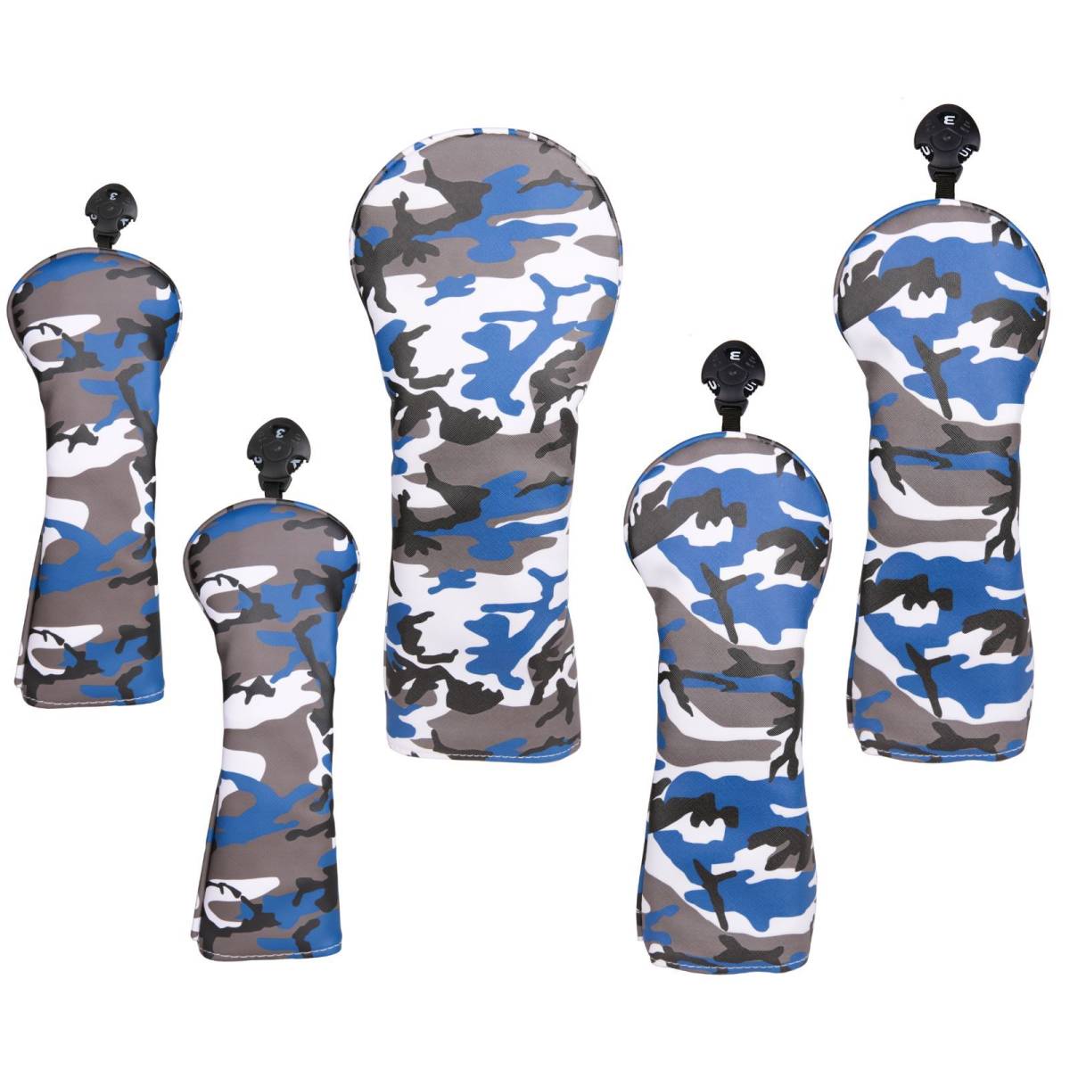 > 高級pu革 ドライバー ウッド FW 2点 ユーティリティ UT用2点 ヘッドカバー 5点セット カモ 迷彩 青