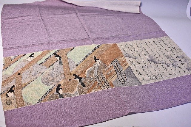 - 風呂敷 ★ ふろしき ★ 淡い紫色 ★ 平安時代の絵模様 ? ★ 伊勢物語 ? ★ 歌物語 ★ 75cm x 77cm ★ 東急 ★ 中古品 ★ 傷みあり ★