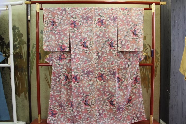 - きもの今昔7588 小紋のきもの 正絹一越ちりめん生地 広衿袷手縫い仕立て 藤ピンクぼかし地 桜にブルーバード 身丈153CM