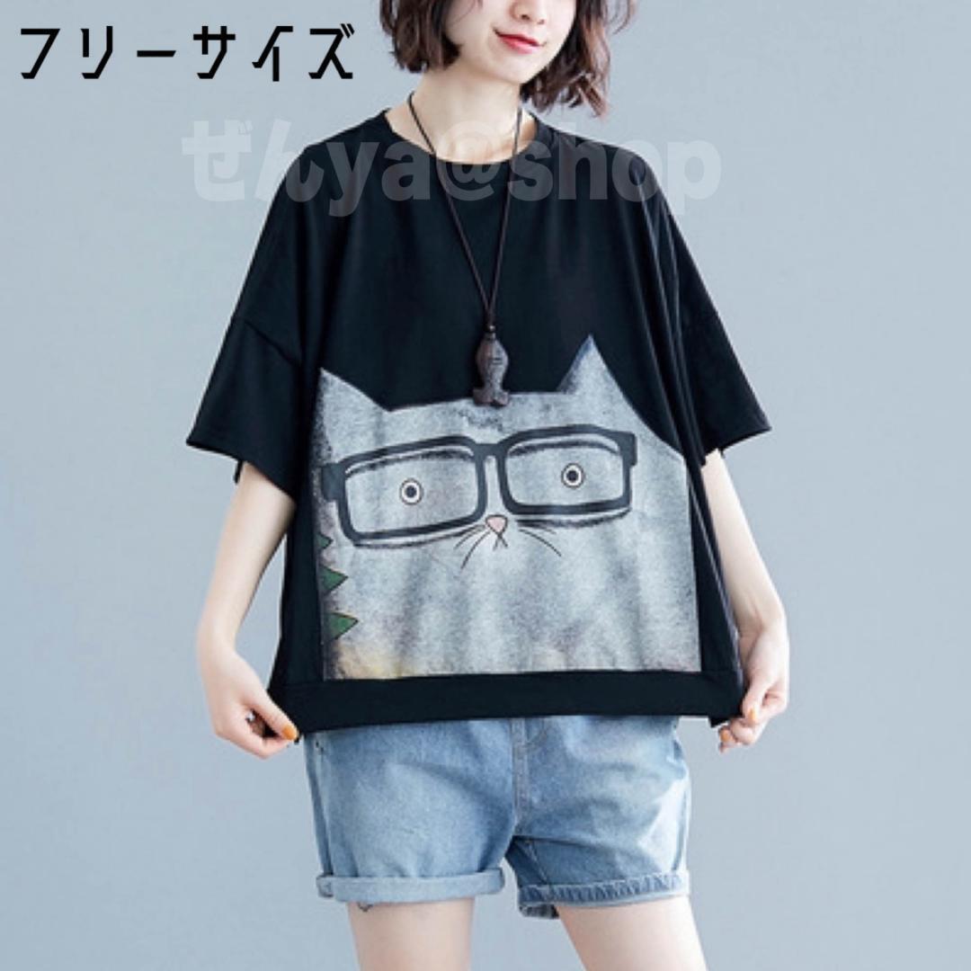 - A364 オリジナル猫イラスト プリントTシャツ フリーサイズ ブラック
