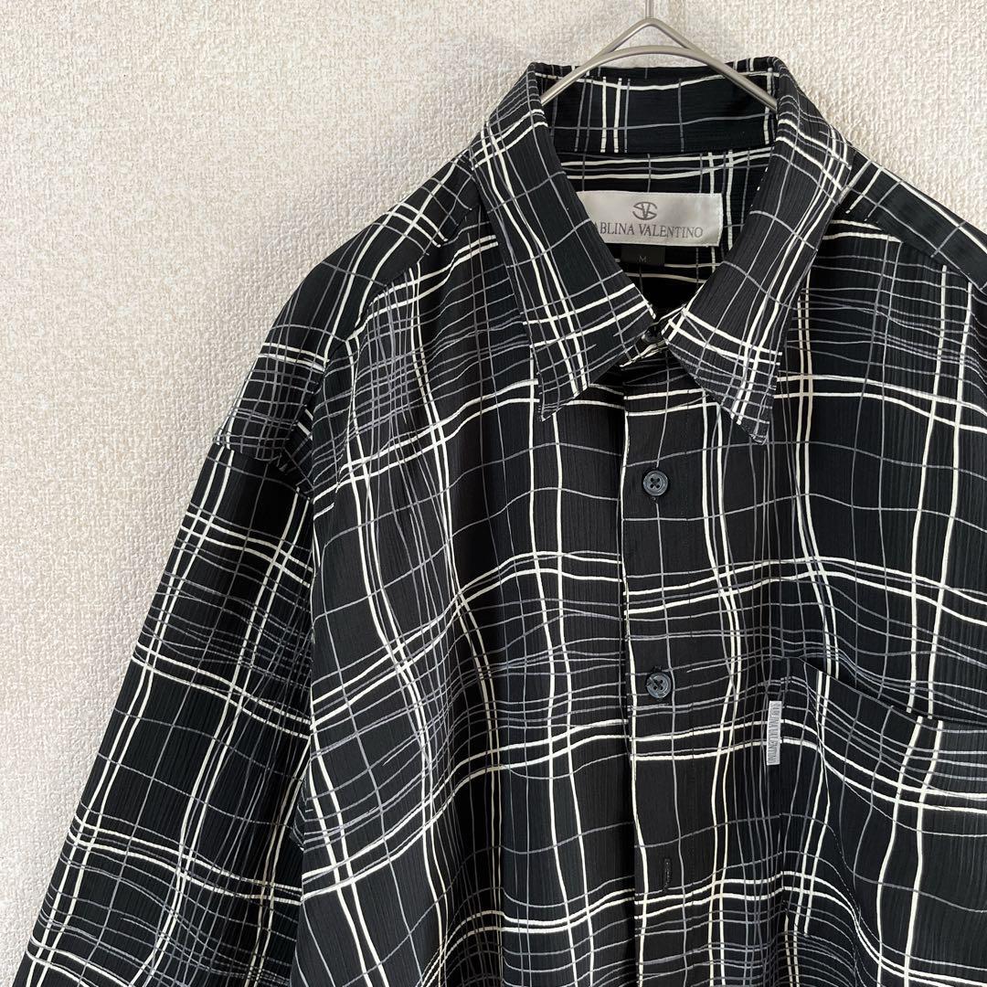 - フリーハンドチェック柄 デザイン長袖シャツ ゆったりMメンズ 黒 F1
