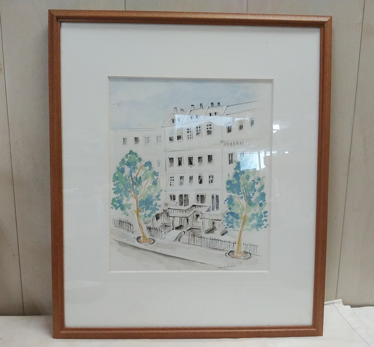 - 水彩画【 アパート街 】作者不明 長期保管在庫品 額入り 額52×61cm インテリア