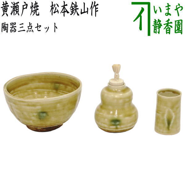 > 茶道具 茶箱用三点セット 陶器三点セット 陶器三つ揃 黄瀬戸焼き 松本鉄山作 抹茶茶碗 振出 茶巾筒 黄瀬戸焼 茶道