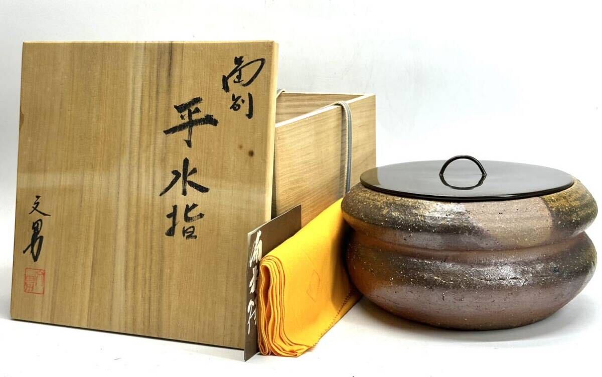 - 個展作 未使用 川端文男 備前 平水指 漆蓋 窯変 茶道具 共箱 共布 栞