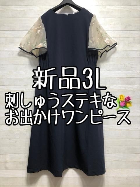 - 新品☆3L紺系♪すけ感×刺しゅう袖おしゃれ切替デザインワンピース☆x997