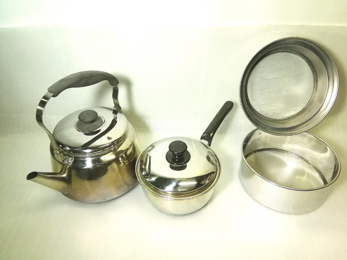 - 調理器具 3点まとめて ケトル 片手鍋 二段ザル 調理用品 おおきなヤカン 鍋 ざる 中古現状品
