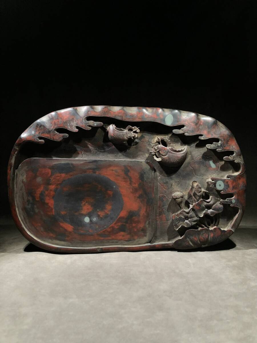 - 中国 古玩硯 旧蔵 【年年有余 朱硯】古美術 文具墨硯 書道道具 珍品 書斎置件 硯歴史物 LOT-10111