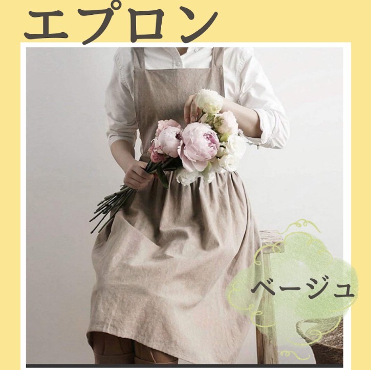 - エプロン 大人 新品 カフェ風 おしゃれ ベージュ 北欧風 無地 コットンリネン 可愛い